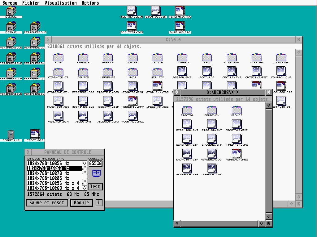 The PCI software layer, the new VDI system and the Radeon driver was designed by Didier Méquignon, author of the TOS for CT60/63. Some developers will propose their work for other PCI cards. The new VDI layer of the TOS is up to 10 time faster than the original VDI on Falcon + CT60/63.
